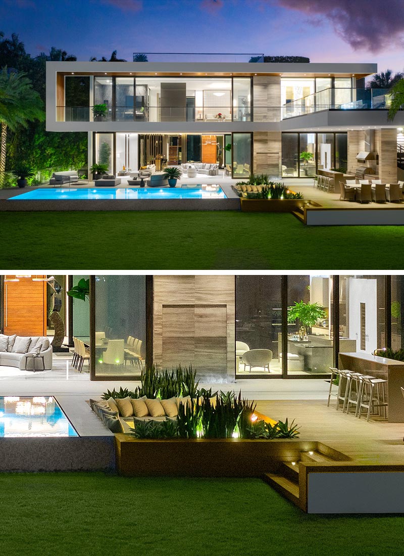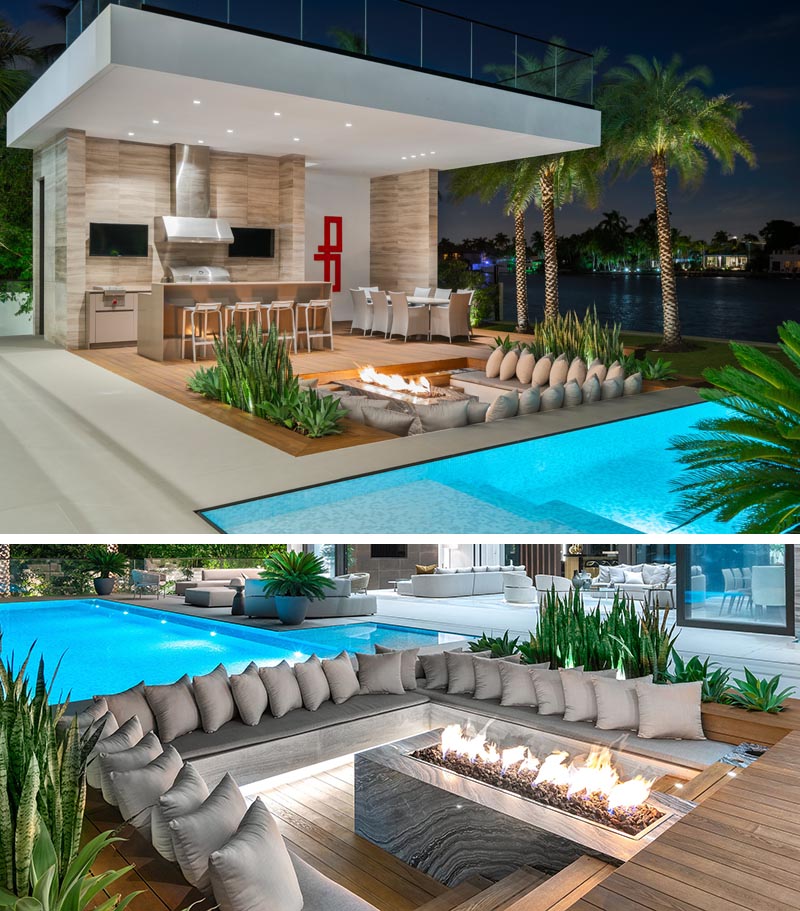 Với thiết kế này, các bộ sofa sẽ có những chất liệu đặc biệt để có thể chịu nắng nóng, mưa gió ngoài trời. Sảnh chìm, nằm giữa bể bơi vô cực và khu vực ăn uống / nhà bếp có mái che, có một vài bước ở hai bên của hố lửa ngoài trời dẫn xuống khu vực tiếp khách.