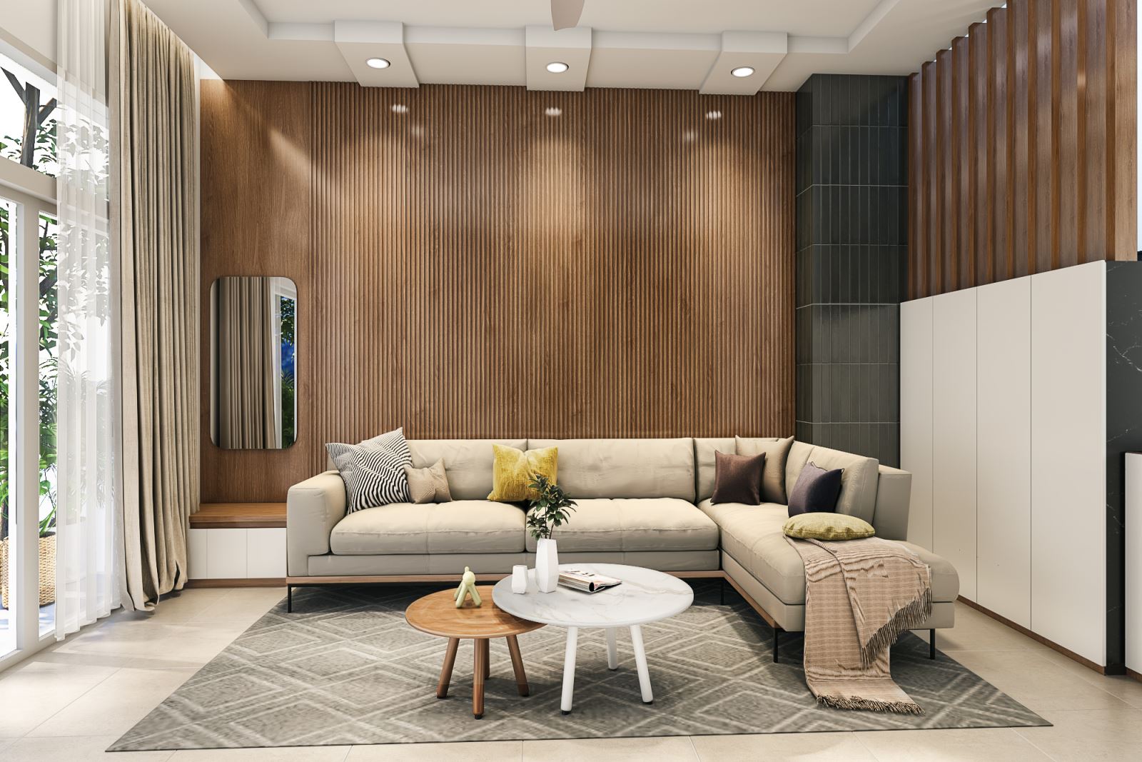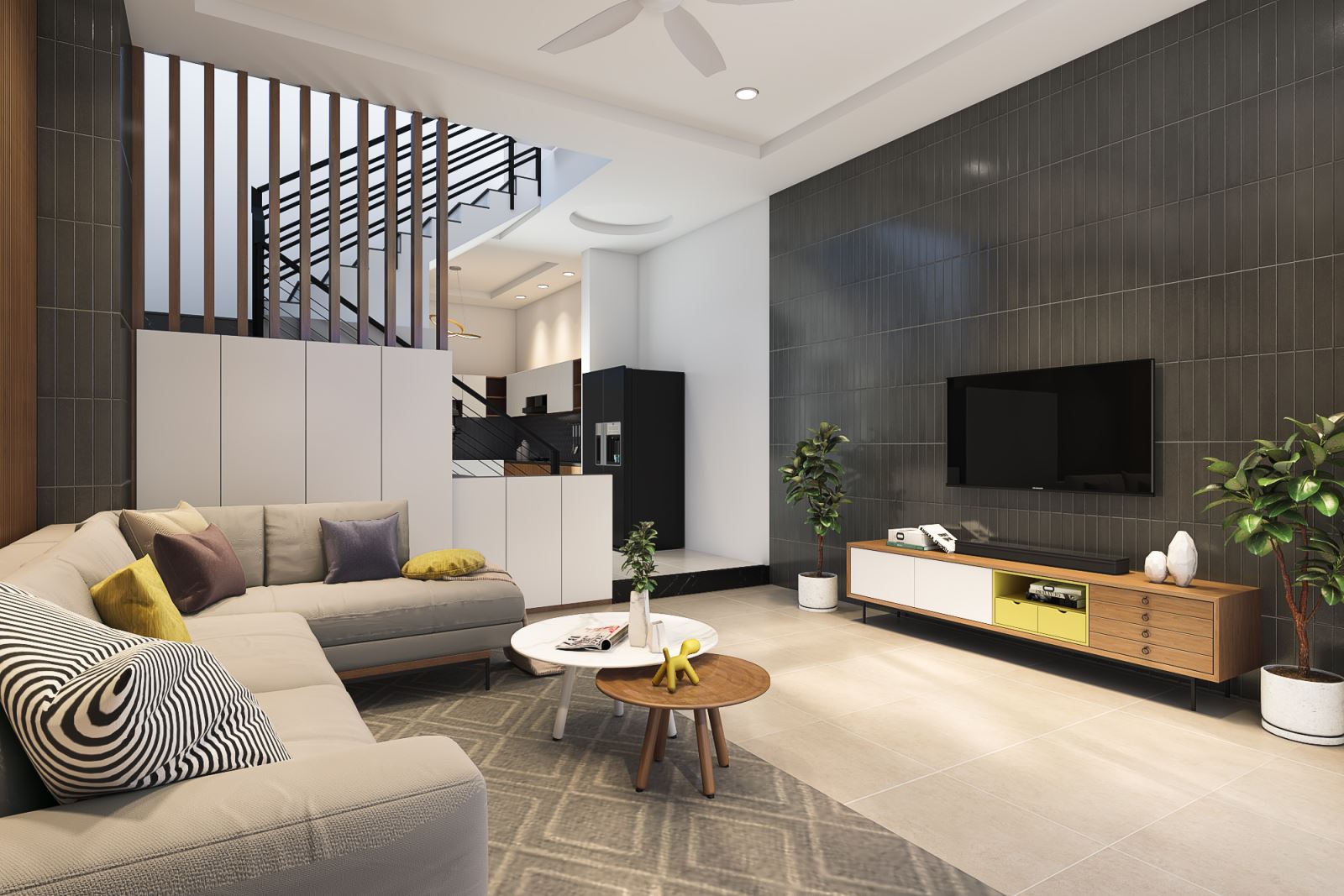 Không gian phòng khách với tông màu trắng làm chủ đạo tạo cảm giác rộng rãi, thông thoáng. Bộ sofa xám bạc làm điểm nhấn cho không gian hiện đại. Vách tường gỗ sau bộ sofa tạo cảm giác ấm cứng, đồng thời thêm một vách tường đá tự nhiên màu nâu đen tạo nét vững chãi, sang trọng cho căn phòng. Các vật dụng được tinh giản và bố trí hợp lý, tạo một không gian tinh tế và xanh mát.