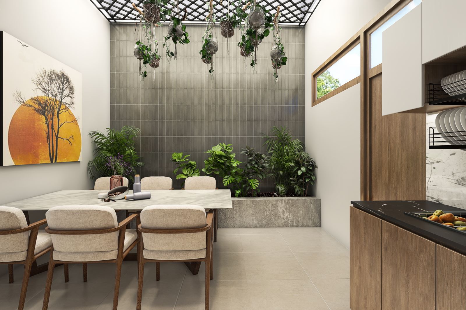 Góc tiểu cảnh ngay khu vực bàn ăn trong nhà bếp giúp không gian thêm sinh động với bồn cây, bức họa mặt trời trên tường và giàn chậu cây treo bên dưới giếng trời, giúp không gian thêm xanh mát và giảm nắng nóng. Gia chủ có thể vừa ăn uống, thư giản và tiếp khách ngay cả khu vực nhà bếp.
