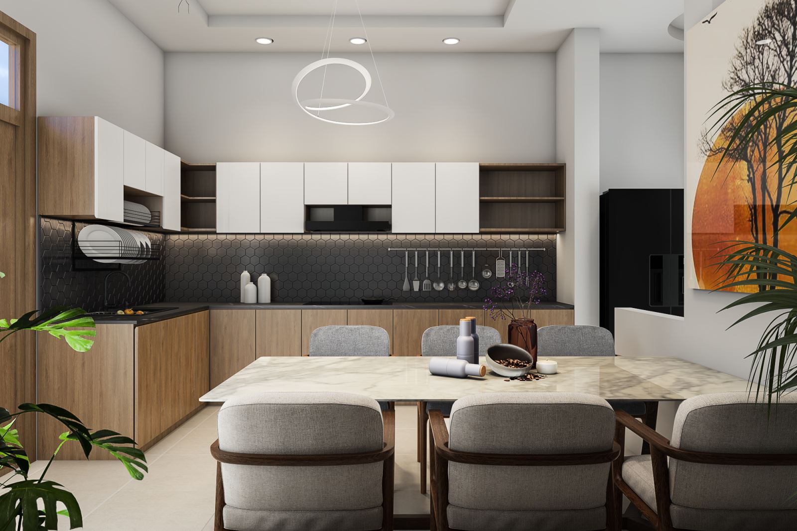 Phòng bếp và nhà ăn được kết hợp tận dụng triệt để diện tích không gian. Tông màu trắng và nâu gỗ phối hợp nhịp nhàng tạo nên sự sạch sẻ và ấm áp cho căn bếp. Hệ thống đèn chiếu sáng cũng được bố trí kéo léo sưởi ấm và làm cho không gian bếp thêm rực rỡ.
