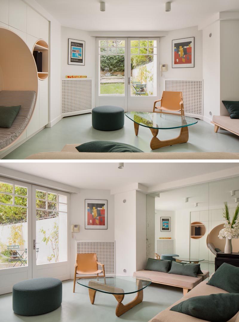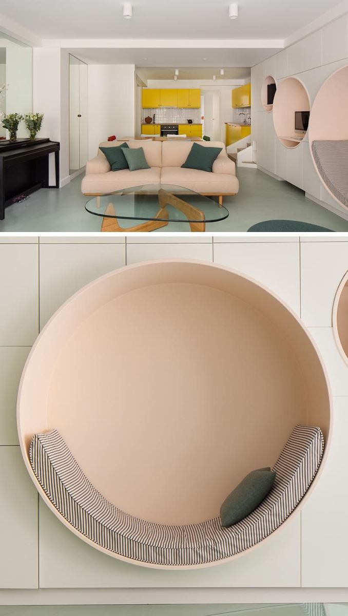 Trên bức tường đối diện, có tủ gỗ trắng tối giản có nhiều hốc tròn được thiết kế với những mục đích sử dụng khác nhau. Vòng tròn lớn nhất đã được xác định là một ngóc ngách chỗ ngồi, với một chiếc đệm bọc lót nửa dưới của hình dạng cong, trong khi những cái khác có giá đỡ cho một máy tính và loa...