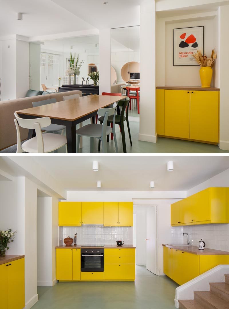 Trong toàn căn hộ, những màu sắc táo bạo đã được giới thiệu để bù đắp cho việc thiếu ánh sáng trong căn hộ, giống như màu vàng sáng mà kiến trúc sư đã được sử dụng trong khu vực ăn uống và nhà bếp.