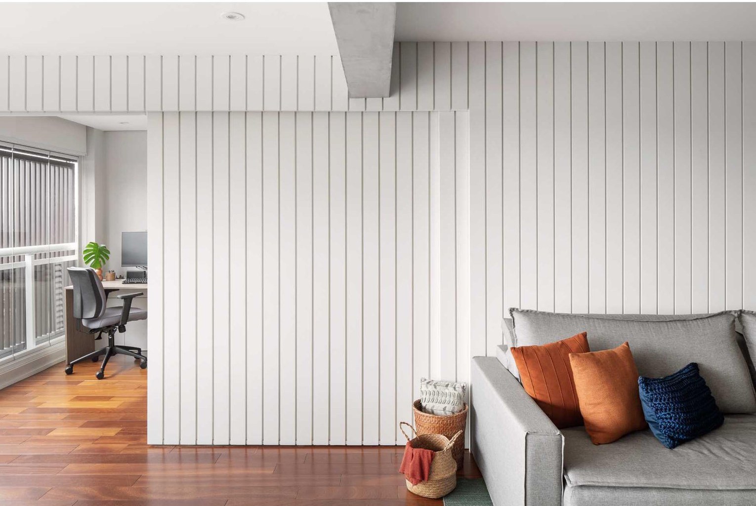 Một trong những điều nan giải khi sống trong các căn hộ chính là diện tích nhỏ, nên khó phân tách các khu vực như phòng khách, bếp, phòng làm việc, phòng ngủ. Tuy nhiên với thiết kế là một bức vách linh hoạt có thể kéo ra kéo vào, bạn có thể hô biến không gian tùy theo nhu cầu hiện tại. Khi cần một không gian tiếp khách riêng biệt, gọn gàng bạn chỉ cần kéo bức vách lại, phần nhà bếp và góc làm việc sẽ được giấu kín phía sau. Khi cần sinh hoạt nấu nướng, làm việc, bạn chỉ cần đẩy bức vách ra là xong.
