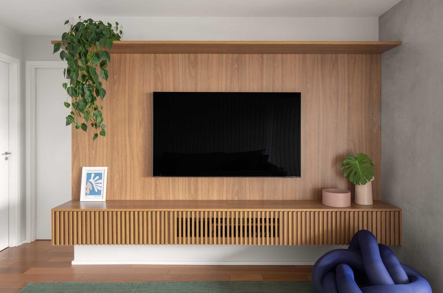 Kê để tivi được ốp gỗ tạo cảm giác ấm áp cho căn nhà