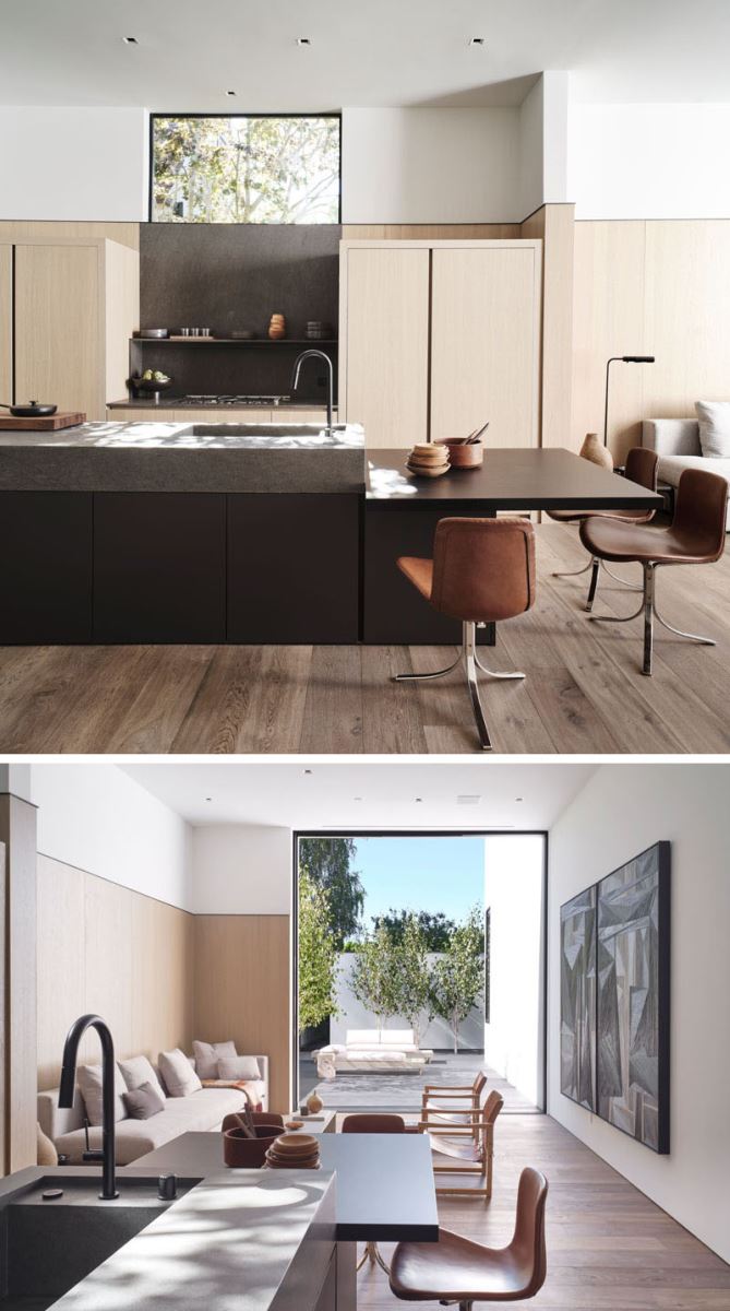 Trong nhà bếp, tủ gỗ sáng màu phù hợp với điểm nhấn của bức tường gỗ, trong khi quầy ăn tại bếp được làm màu tối, nhìn sang trọng và sạch sẽ.