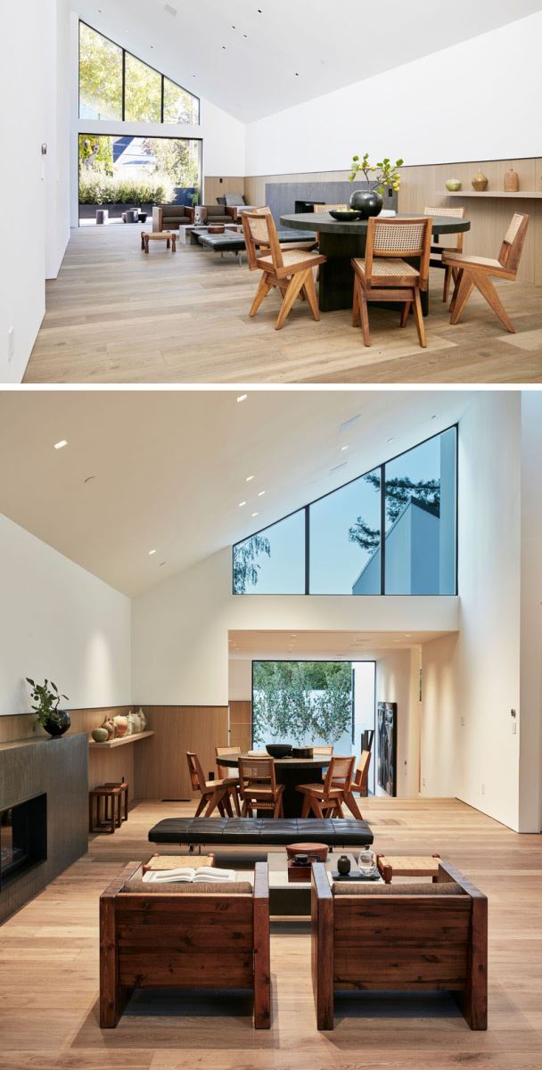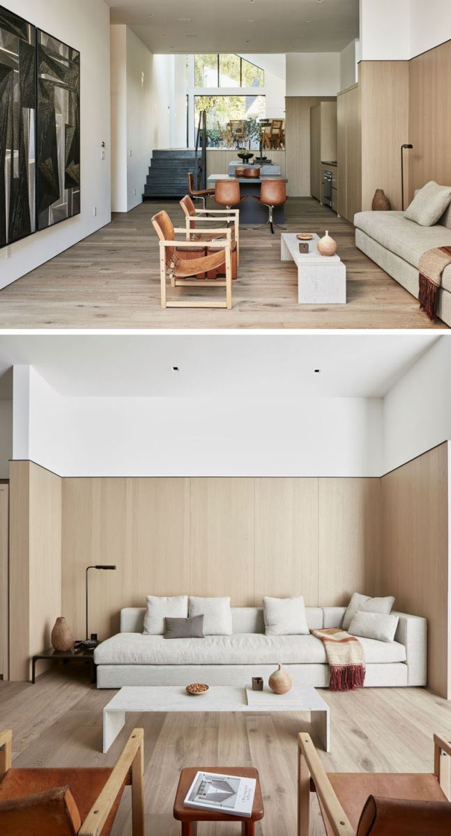 Thiết kế trong nhà theo phong cách tối giản, màu sáng với tường trắng kết hợp với màu nâu cánh gián của gỗ.