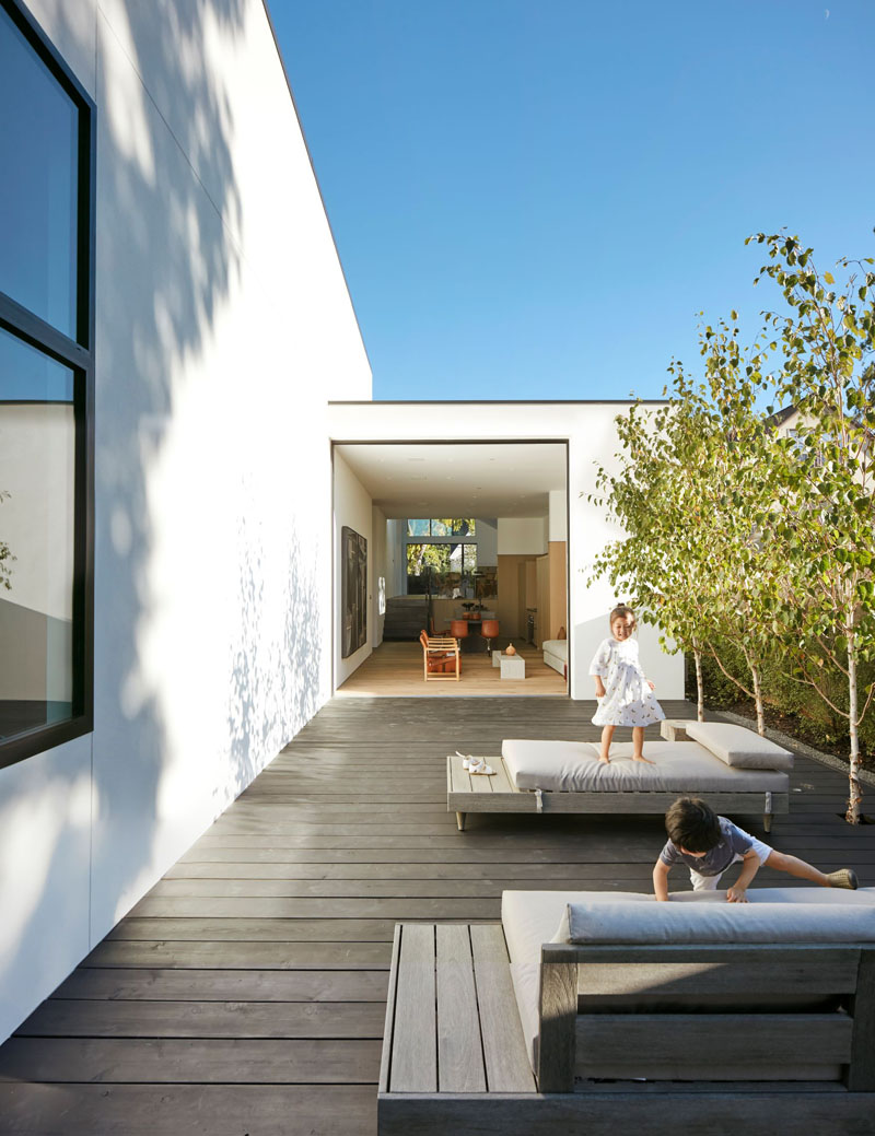 Khoảng sân sau nhà, tiếp giáp với phòng đọc sách làm việc được lót bằng gỗ màu sậm. Khoảng sân này được trồng cây xung quanh và có 2 chiếc giường nhỏ để tiện nghỉ ngơi ngoài sân.