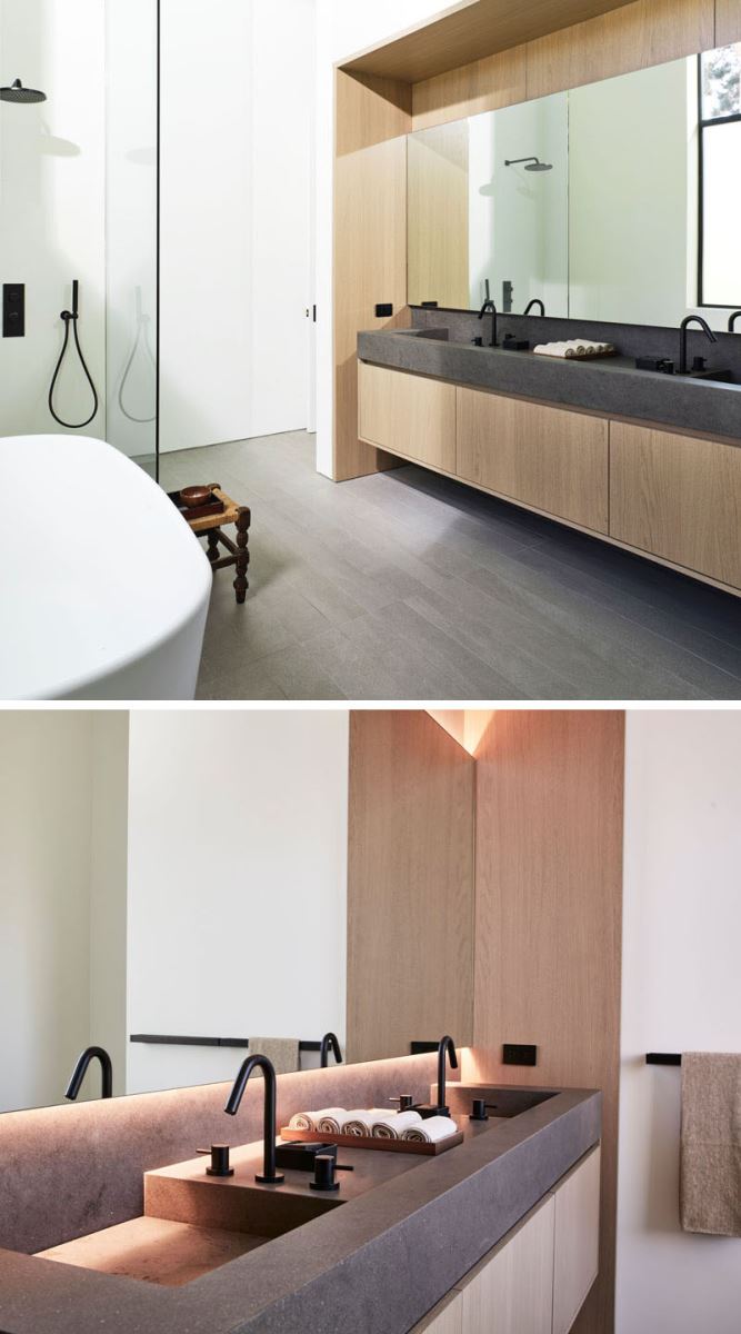 Phòng tắm master, có một bàn trang điểm bằng gỗ và đá màu xám đen nằm bên dưới một tấm gương lớn với ánh sáng ẩn.