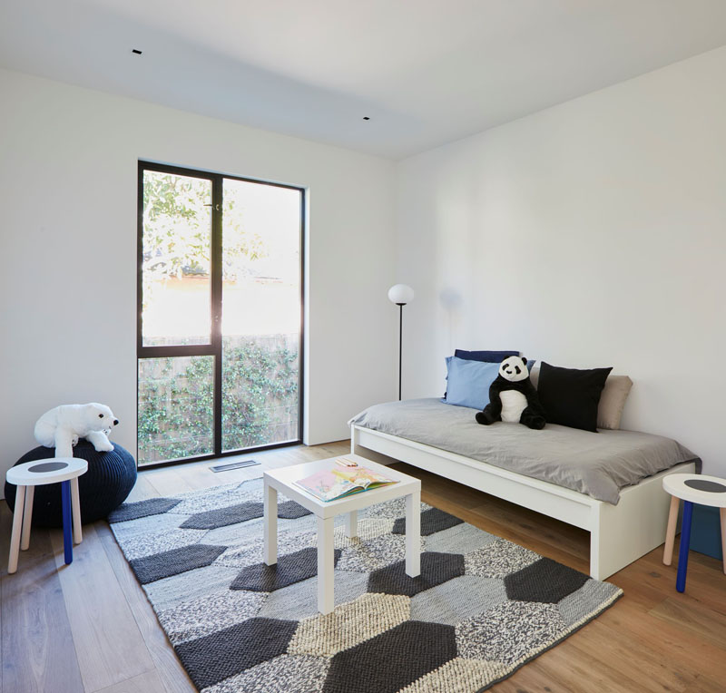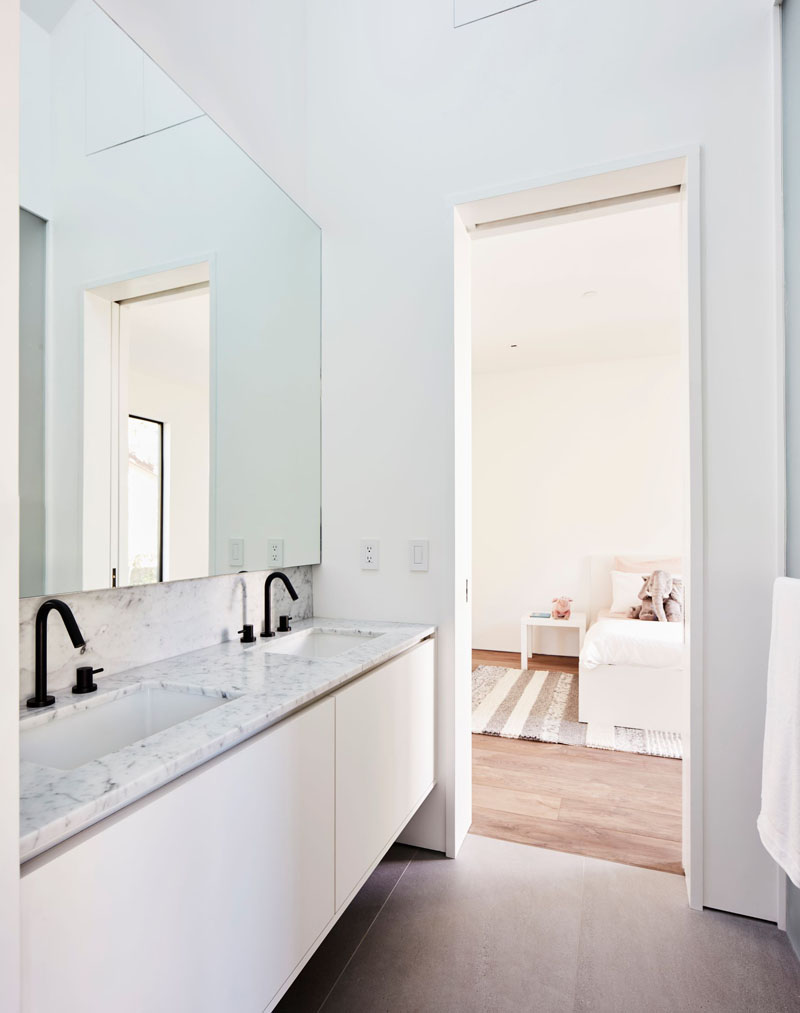 Phòng trẻ em được thiết kế gam màu trung tính trẻ trung. Phòng tắm trẻ em thiết kế phong cách tối giản, bồn rửa đôi với các điểm nhấn màu đen.