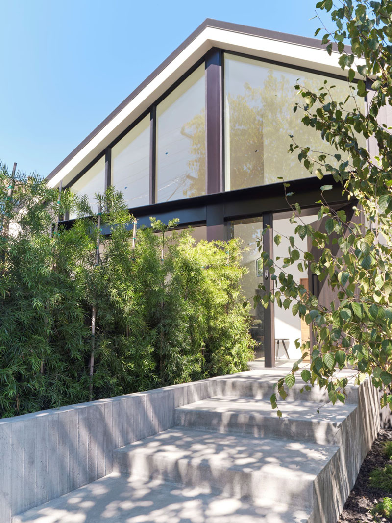 Dẫn vào cổng chính ngôi nhà là các bậc thang bê tông cực kỳ tối giản.