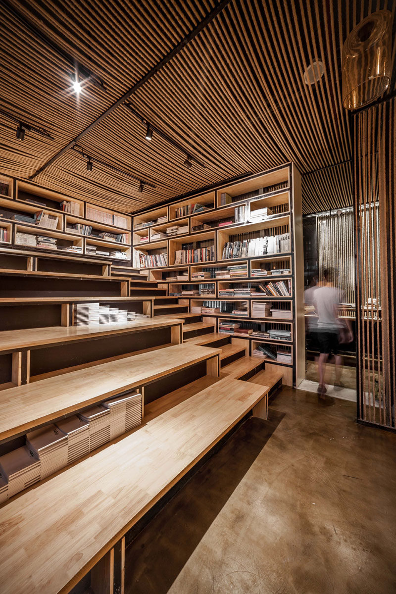Trần dây cũng dẫn đến 'cầu thang đọc sách', nơi có ghế ngồi xếp tầng và giá sách lộ thiên.