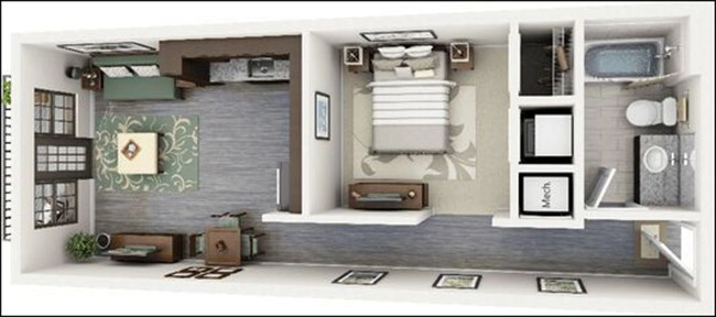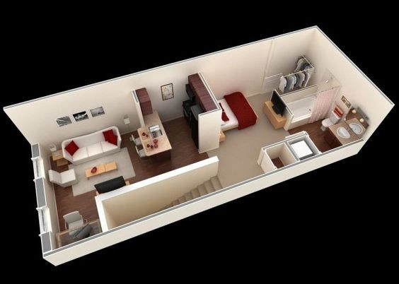 1. Căn hộ một phòng ngủ này có dạng hình ống, vì thế các không gian phải bố trí theo chiều dọc. Trong căn hộ này, chủ nhà đã dành đến hơn 1/3 diện tích cho phòng khách - bếp - ăn. Phòng ngủ, khu vệ sinh có diện tích nhỏ nhưng nhờ sắp xếp gọn gàng mà vẫn rất thoáng đãng.