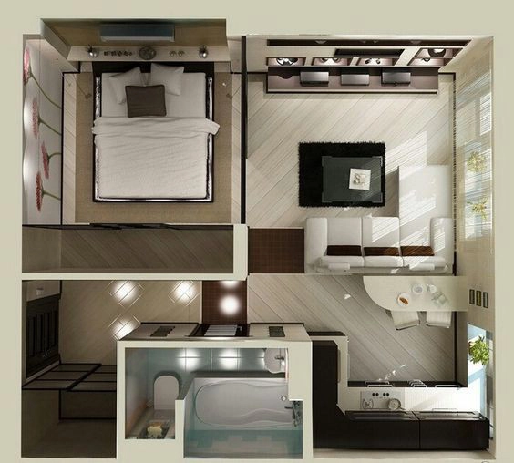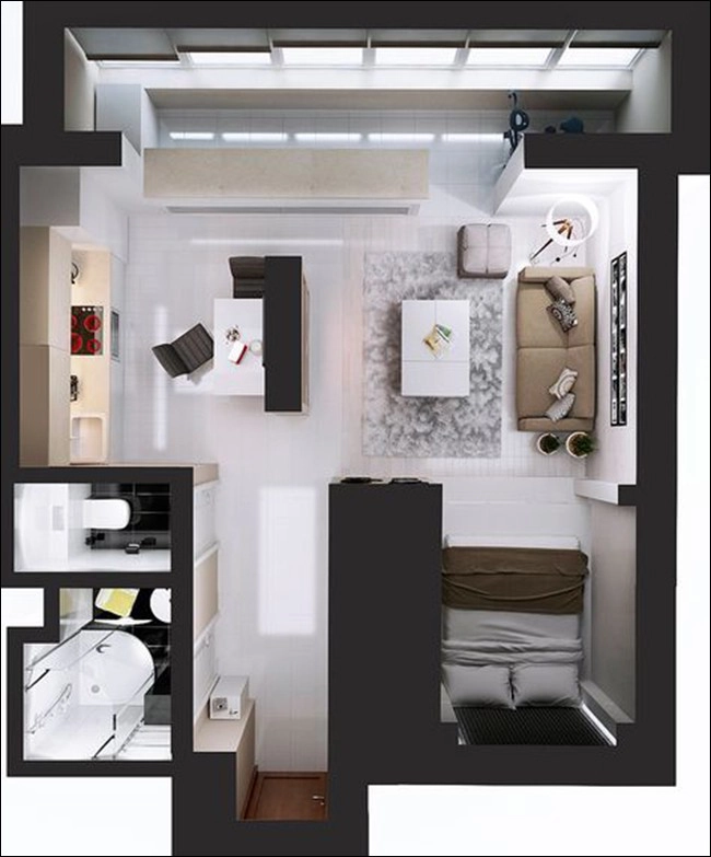 10. Đây là mẫu căn hộ một phòng ngủ siêu đẹp, siêu dễ ứng dụng cho người độc thân. Những tủ đồ tích hợp kệ âm tường giúp căn hộ giữ được sự gọn gàng cho nơi ở.