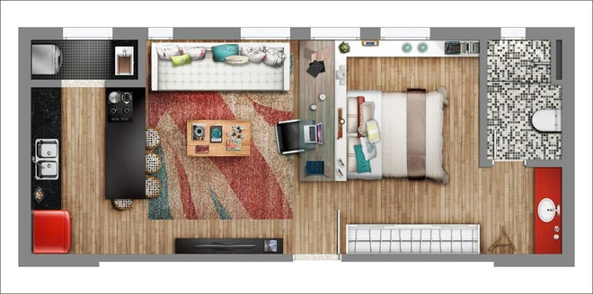15. Căn hộ này rất thích hợp cho những người quảng giao, coi trọng không gian tiếp khách và nghỉ ngơi. Các không gian phụ như bàn ăn, nhà vệ sinh tuy nhỏ nhưng nhìn chung đều đáp ứng được nhu cầu sử dụng của người độc thân.